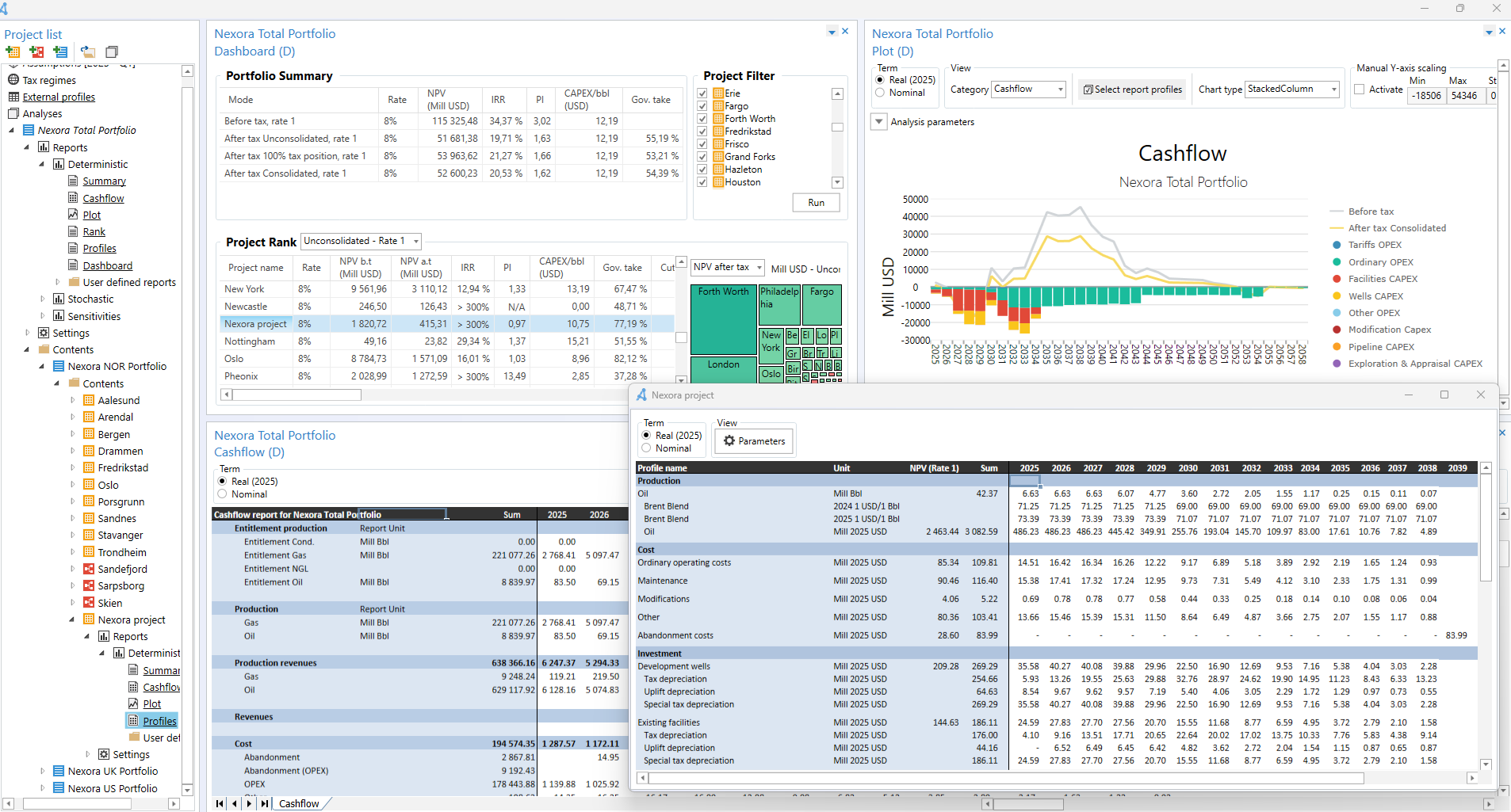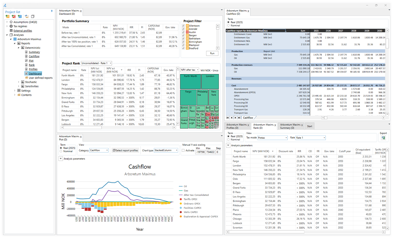 In addition to the standard reports showing the cash flow and KPIs of the entire portfolio, a portfolio calculation also creates some additional reports. A rank report shows a table with the individual project results, which may be sorted by the respective NPV, IRR, and total production, costs, investments, etc. In the profile report, you find all the results from the portfolio calculation, broken down at the project level. The report is set up with advanced functionality to group, sort, and filter the results by any category, e.g., production type, cashflow, or NPV.