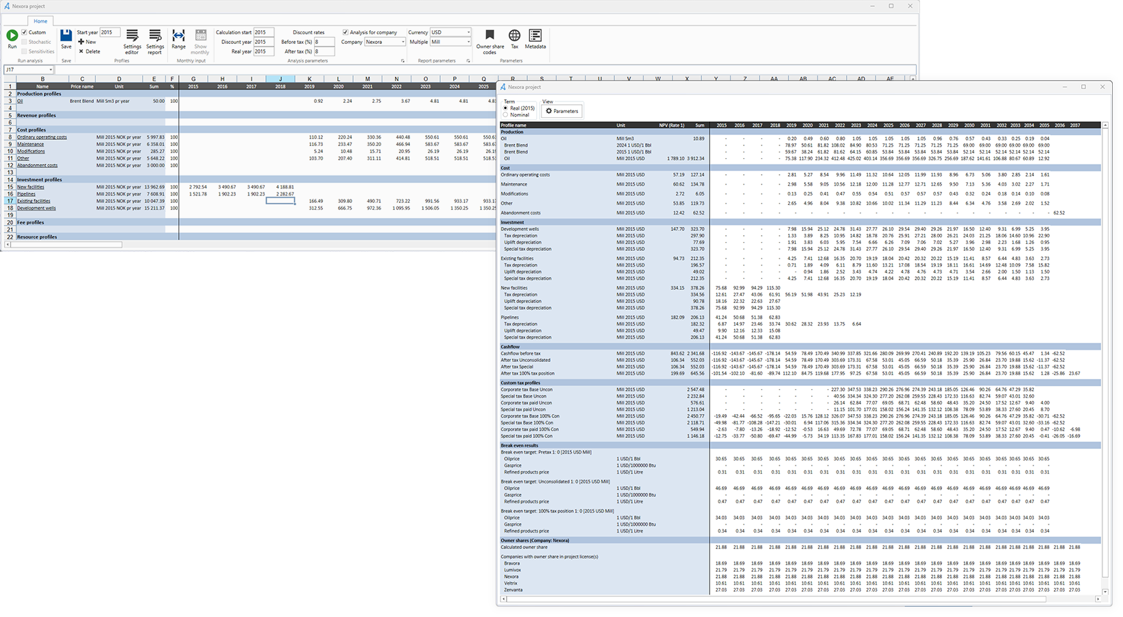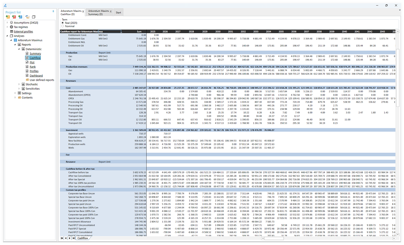 After calculation, the results are presented in standard reports, both in table formats and visually in graphs and figures. The reports include key performance indicators like the NPV, IRR, and the break-even price. An extensive profiles report gives you all of the profiles involved in the calculation, including the resulting cash flow before and after tax. Arcast also lets the users build and customize individual reports focused on the results most relevant to the different analyses. All results may be exported in a spreadsheet format to be used in further analysis and reports.
