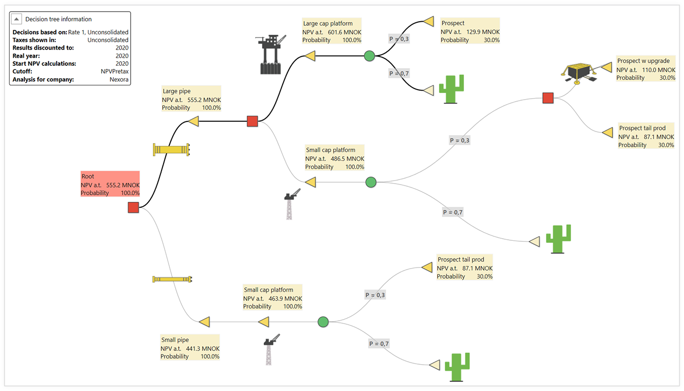 When calculating a decision tree in Arcast, all possible outcomes are calculated. All data on a branch, from the root to the end node with no further branches, is consolidated. Then, the results are weighted with any probability along the branch. At each decision node, the decision that gives the highest NPV is chosen. At the root of the tree, you find the calculated expected values of productions, costs, investments, and cashflow in the same structure that is used for a project or portfolio.